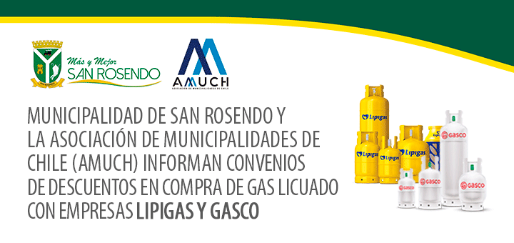 San Rosendo, marzo de 2022; Lograr la compra de cilindros de gas a mejor precio es parte del objetivo del convenio dado a conocer entre la Municipalidad de San Rosendo, Asociación de Municipalidades de Chile (AMUCH) y empresas del rubro. Se trata de descuentos al valor de mercado que debe tener una inscripción previa de quienes deseen optar por estos descuentos. Convenio con empresas Lipigas y Gasco, que se indican en la gráfica que se adjunta, permitirá descuentos para los...